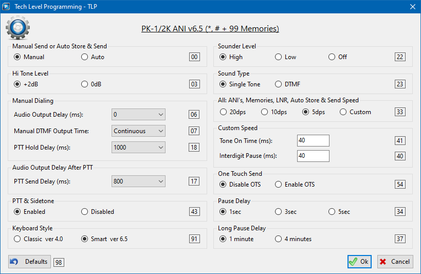 In addition to programming the memory, default values can also be configured using the Tech Level Program (TLP) interface, as shown below.